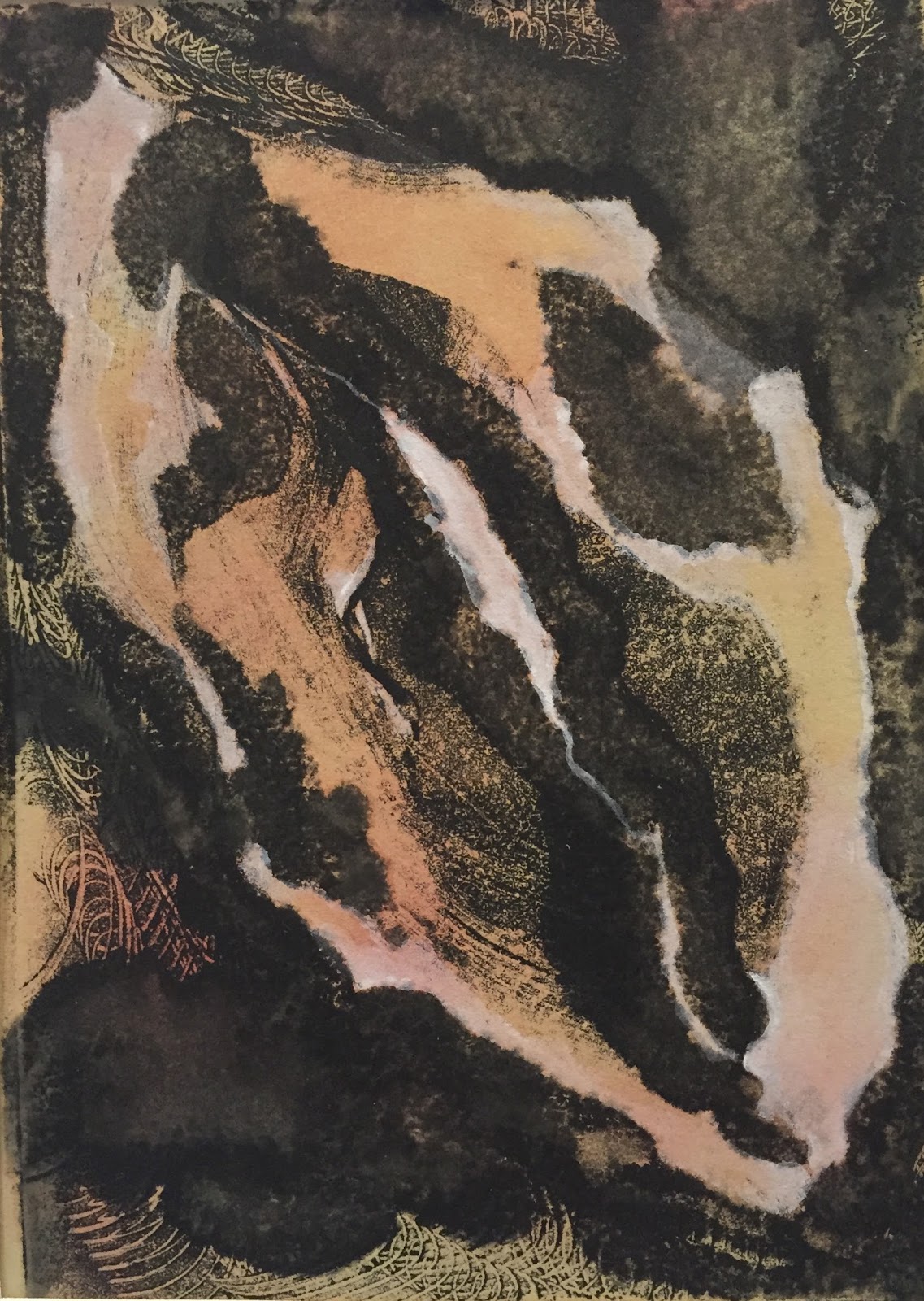 Stitching on Rives BFK. Digitized in 6D Embroidery software. STabilized with medium weight cutaway stabilizer. Threads are rayon, polyester or cotton. There is a thin layer of batting between the stabilizer and the paper. Hand coloring with watercolor: bold pours; brush swooshes and staining from the back of the stitching with the rayon thread. The rayon wicked the watercolor to the front, containing it to the stitched area.